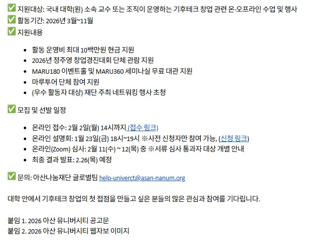 [타기관 홍보] 2026 아산 유니버시티 기후테크 창업 문화 확산 사업 참가자 모집(~2.2. 오후 2시)